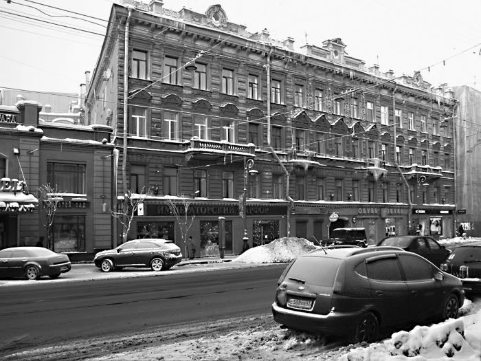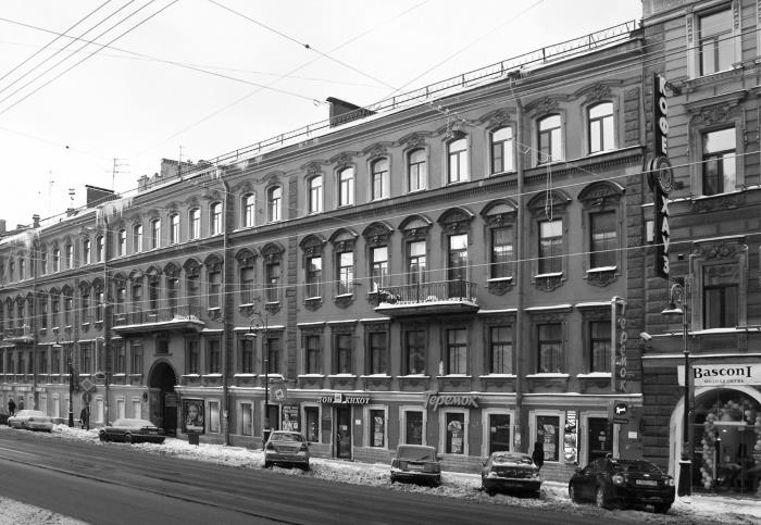 В 1895–1909 гг. здесь жили домовладельцы Анна Павловна Винберг (в ее собственности дом находился до 1918 г.) и Владимир Павлович Лихачев (владел также домами № 29/66 на углу наб. р. Фонтанки и Невского пр. и № 28 по Караванной ул., 6, по Кузнечному пер.; недвижимость в 1900-х гг. унаследовал чиновник Государственной канцелярии губернский советник Павел Павлович Лихачев). Фармацевт Бендель Беньяминович Борель содержал здесь парфюмерный магазин, купец Николай Васильевич Богданов содержал продажу шапок, шляп и приклада, купец Николай Федотович Грибков – торговлю обувью, К.Х. Кестнер – кондитерскую, перешедшую его сыну Николаю, жившему в доме № 20 по Загородному проспекту и содержавшему там булочную, купец Петр Иванович Кириков – торговлю офицерскими вещами и бельем, вдова купца Надежда Петровна Кузнецова – корсетную мастерскую, Зинаида Михайловна и Прасковья Тимофеевна Немировы – суровскую торговлю, Марк Адольевич Оцуп – комиссионную торговлю.