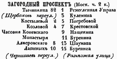Головной участок Загородного проспекта от Владимирской площади до Пяти углов относился ко 2-му кварталу Московской части, и после 1855 г. его дома получили новую нумерацию: от № 1 (дом Тычинкина) до № 11 (дом Лапиных) и от № 2 (дом Ремесленной управы) до № 16 (дом Буренина). После 1867 г. с постройкой еще одного дома по правой стороне проспекта здесь изменилась нумерация (бывший угловой дом Буренина получил № 18).