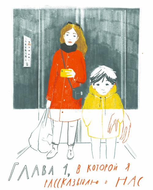 Это мы с мамой в лифте. Мы живем на тринадцатом этаже. Мама ненавидит наш дом: она говорит, у нее кружится голова, когда она смотрит вниз с балкона. А мне, наоборот, нравится. Однажды лифт сломался, и нам пришлось спускаться вниз по лестнице. До этого я никогда там не был. Оказалось, кто-то написал на ступенях признание в любви. Между нашим этажом и двенадцатым было написано «милая». Между двенадцатым и одиннадцатым – «прекрасная». Между одиннадцатым и десятым – «замечательная», между десятым и девятым – «любимая». Я забыл, что было между девятым и вторым, но в самом низу автор написал: «Ты самая». Мы с мамой так и не поняли, где начало, а где конец, хотя я думаю, что начало на первом.