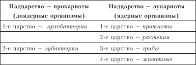 Около двух десятков лет тому назад в макросистеме организмов среди прокариот стали отмечать новое царство – архебактерии. Представители данной группы привлекли к себе пристальное внимание биологов. Будучи бесспорно прокариотными организмами (т. е. не имеющими оформленного ядра в клетке), они по организации генетического аппарата, ряду биохимических свойств, особенностям обмена веществ обнаруживают определенную близость к эукариотам. Обобщая все изложенное выше, можно представить современную макросистему живого в виде табл. 4.