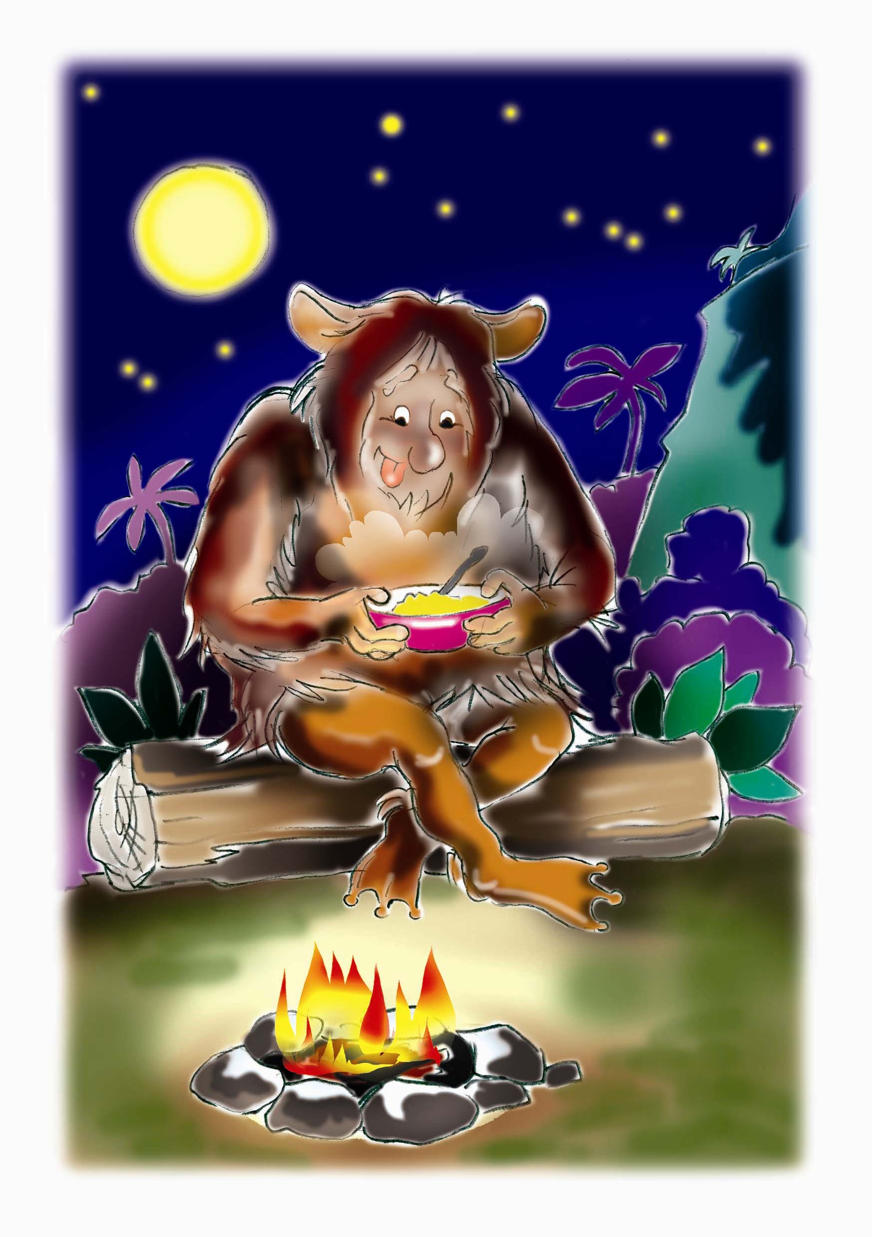 Поколебавшись, чудище подошло к костру, и ему уступили место. Киск подал ему большую тарелку, в которую он положил разнообразные угощения. Понюхав, чудище попробовало сначала одно кушанье, потом другое – и улыбнулось. В сущности, не такое уж это было и чудище: представьте себе жутко косматого человека, с собачьими ушами, с лягушачьими перепонками между пальцев ног.