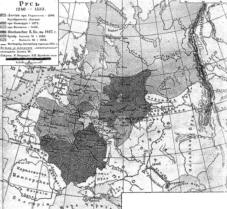 Русь в это время оправлялась от татарской неволи. Города русские, Смоленск, Рязань, Москва, Новгород, были один от другого независимы. Князья, правившие этими городами, часто враждовали друг с другом, и пятьсот лет тому назад неспокойно было на Руси. Но постепенно стал усиливаться Московский князь. Он покорил себе соседних князей, смирил Новгород, усилился, завел порядочное войско.