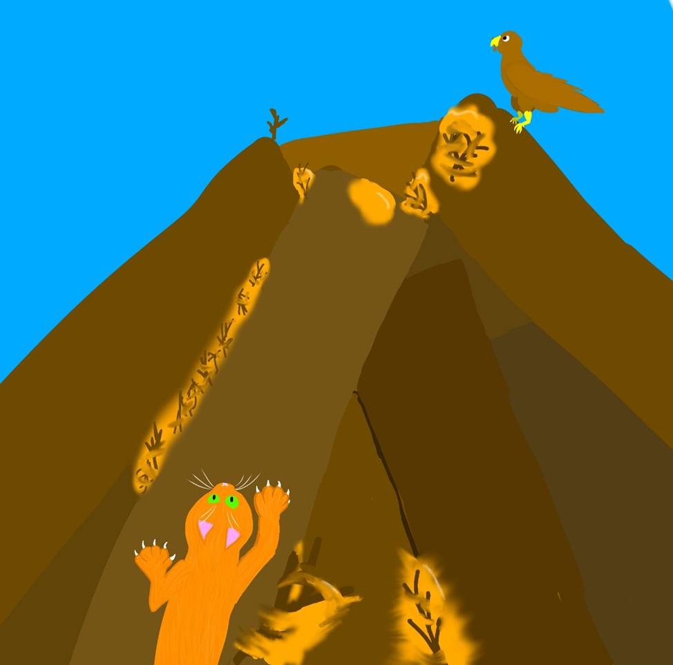 Однажды Келли спала в домике, но вдруг кошка услышала странный шум. Он шёл откуда-то сверху. Келли посмотрела на крышу домика и увидела там небольшого орла. Он сидел на крыше и вытаскивал из неё ветки. С каждой вытащенной веткой крыша становилась всё более хлипкой, потому что эти ветки играли очень важную роль – они были перемазаны смолой и служили перекрытиями для крыши.
