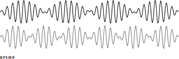 Рис. 1.4. Черная и серая волны имеют одинаковую частоту. Однако скорость модуляции разная, то есть звук, обозначенный серой волной, включается и выключается быстрее, и поэтому он звучит выше, чем звук, обозначенный черной волной. Более быстрая модуляция звука, происходящая из-за более быстрых колебаний голосовых связок у женщин, объясняет более высокие голосовые ноты при произнесении одних и тех же слов.