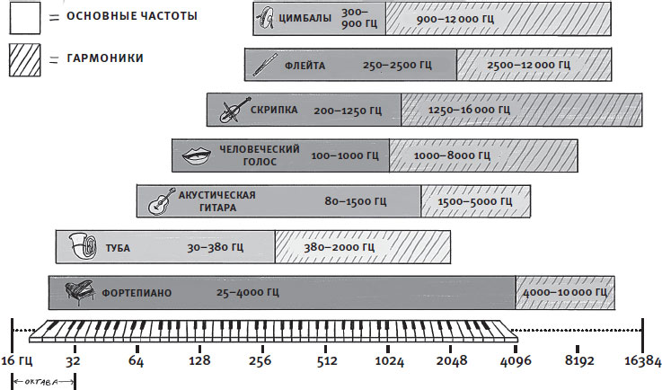 Рис. 1.7. Полный диапазон частот голоса и музыкальных инструментов. Слева показан диапазон основных частот, справа – диапазон гармоник.