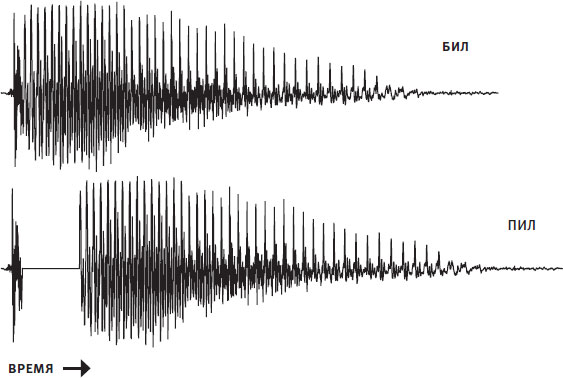 Произнесите вслух слово “был”. А потом слово “жил”. Можете описать, чем различаются механические движения вашего рта? Это довольно просто. В первом случае ваши губы смыкаются, а язык занимает некую нейтральную позицию. Во втором случае губы слегка приоткрыты, а задняя часть языка прижата к небу. А теперь скажите “бил” и “пил”. Это сложнее. В чем тут разница? Механическая разница между произнесением “б” и “п” не так уж очевидна. Язык и губы в обоих случаях находятся фактически в одном и том же положении. Основное отличие заключается во временной развертке – когда вы начинаете произносить гласную, то есть когда голосовые складки начинают издавать звук “и”. Произнося слово “бил”, вы включаете голос почти сразу. Однако при произнесении слова “пил” между тем, как ваши губы раскрываются, и тем моментом, когда вы начинаете произносить гласный звук, имеется очень короткий промежуток времени. В верхней части рис. 1.8 изображена звуковая волна слова “бил”. В нижнюю волну я включила паузу длительностью 1/20 секунды. Все колебания двух линий идентичны, за исключением этой добавленной паузы. Небольшой паузы до начала произнесения “и” достаточно, чтобы вторая волна отчетливо звучала как “пил”. Различие во времени в несколько долей секунды создает значительное различие в речи. Это одна из многих причин, почему для обработки таких едва заметных изменений звука нам с вами требуется сверхбыстрый слуховой мозг.