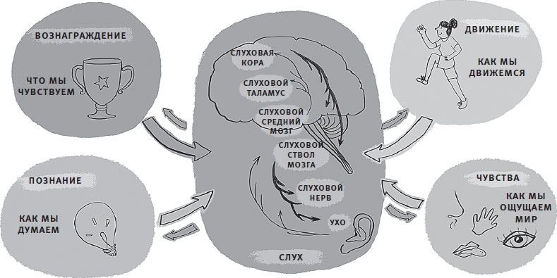 Вверх и внизЗвуковой разум обширен. Когда мы слушаем, электрические сигналы проходят через мозг, перемещаясь восходящими и нисходящими потоками, взаимодействуя с другими ощущениями – с тем, как мы движемся, что мы думаем и что мы чувствуем. Вся эта мозговая сеть позволяет нам осмысливать звук – извлекать смысл из нашего звукового окружения (рис. 2.2).