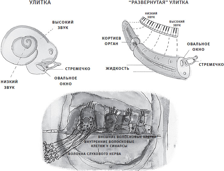 Рис. 2.4. Вверху: улитка в свернутом и развернутом виде. Основание свернутой улитки, где стремечко сталкивается с овальным окном, настроено на восприятие высокочастотных звуков. Верхушка (центр) улитки предпочитает низкочастотные звуки. На “развернутой” улитке справа это изображено схематически по аналогии с клавиатурой, а на срезе виден кортиев орган. Внизу: кортиев орган. Мы видим одну внутреннюю и три внешние волосковые клетки (зажатые в виде сэндвича между текториальной и базилярной мембранами) и их связь со слуховым нервом. Воспроизводится с разрешения из статьи Арнольда Старра. Фото Тома Лэмба.