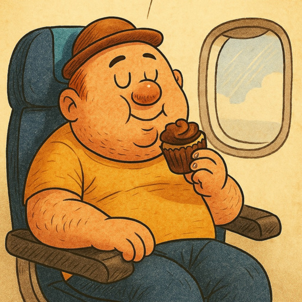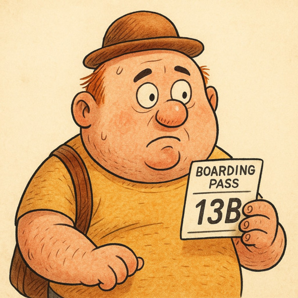 – Простите! – с усилием протиснулся к проходу пассажир Пышкин. Он был кругленький, с пузиком, который слегка вибрировал при ходьбе, как желе в турбулентности. – У меня билет! Вот, смотрите – 13B! Где моё законное сидалище?
