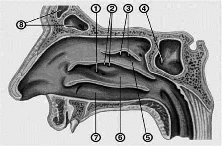 Носовая же полость, в которую воздух из окружающей человека среды попадает при вдохе, глубоко вдаётся внутрь головы и состоит из двух половинок, в каждой из которых находятся извилистые ходы, покрытые слизистой оболочкой.