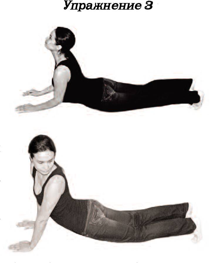 упражнению: выполнять варианты кобры, представленные на фото. Только большие пальцы ног и ладони касаются пола, следовательно, бедра остаются над ковром. Ступни раздвинуты на 30 см (это важно). Когда положение принято, повернуть голову, плечи и туловище до тех пор, пока не удастся увидеть противоположную пятку (то есть, если поворачиваетесь направо, то надо увидеть левую пятку). Не оставаясь неподвижным, вернуться в исходное положение и делать в другую сторону. Повторить 4 раза двойное движение. Время 10-15 секунд.
