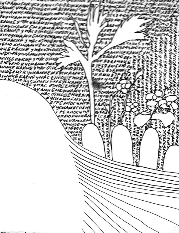 Лужки коломенские, склоны, склонны. Гадость-снедь в бумажном пакете. Погода тучками ветрено набегает на лицо, колышет незабудки мыслей. Наливается непогода двумя птицами против течения воздушного. Набирают птицы высоту прорезями перьев на концах изогнутых крыльев. Босые ноги в пальцах земной зелени. Сухие прошлогодние упреки сухостоин трав. Листья исподним переворачиваются ветром слева. Бела телом дама. Написала в альбоме рыжими буквами «kiss me». Написанное потерялось немедленно в траве и смотрит на мужчину в трусах, поворачивающегося на маленьком стульчике, который иначе как пипеткой и не назовешь. И вот оно пялится на мужчину с пипеткой или на пипетке и вся эта конструкция на холме. Ушел в кусты. Белая дама делает глотки красного раствора, рвет траву и навинчивает голубое на прозрачное. Что не подумаешь – все уже думал сто раз. Возьмешься рукой, а там следы давнишние. Вот кораблик плывет в Марьино, бурля на изгибе. Птицы булькают, отказывая ненастью в приюте. Далеко и высоко палочка самолета привозит кого-то издалека. Белая дама рвет листы и трет салфеткой цветные пальцы. Мужчина с пипеткой натягивает носки и ставит стопу пяткой на землю, а пальцы растопыривая. Наверное, дома у него есть ярко-рыжая нитяная мочалка, которой он тщательно трет низ живота. И не пускает мочалку никуда дальше ванной комнаты. Хоть тресни. Так и останется мочалка узницей. Яркая веселая, дерзкая и вся лишь для того, чтоб тереть посторонний живот. Нет бы он взял ее на прогулку. Пипетку-то – вон, выгуливает. Белая дама шмыгает носом и беспокойно ерзает. Пойду прикоснусь. Теперь. Когда мужчина и его пипетка, покидая ветреные травы, идет к мочалке.