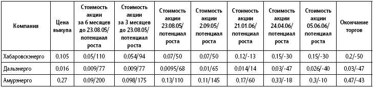 3. Максимальная доходность инвестирования получается исходя из покупки актива до момента, когда утверждена окончательная стратегия. В нашем случае максимальный доход – за 12 месяцев (за шесть до объявления варианта реорганизации) составил 200 % (ОАО «Амурэнерго»). Доходность по трем компаниям варьировалась от 70 до 200 %.
