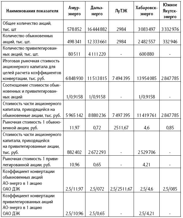Для целей расчета коэффициентов конвертации акций АО-энерго в одну обыкновенную акцию ОАО ДЭК, номинальной стоимостью 1 рубль, стоимость акции («цена размещения») ОАО ДЭК была принята на уровне 2,5 рубля. Данная стоимость акции ОАО ДЭК определена исходя из необходимого и достаточного уровня (с учетом рисков этапности схемы реформирования) для достижения следующих целей: соотношения между чистыми активами ОАО ДЭК и ее уставным капиталом в пользу чистых активов; отсутствия существенных бухгалтерских убытков на балансе объединенной компании при его формировании.