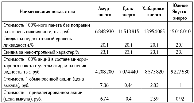При этом стоимость акций определялась оценщиками для расчета коэффициентов конвертации акций в составе 100 % контрольного пакета акций без учета скидки за низкую ликвидность. Результаты оценки были представлены в виде рыночной стоимости одной обыкновенной и одной привилегированной акции каждого АО-энерго.