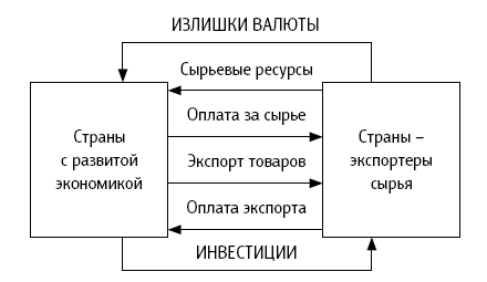 Так как крупнейшим западным державам невыгодно создавать себе конкурентов, то для реализации собственных товаров вне пределов своей страны они вынуждены создать условия, позволяющие другим странам закупать их продукцию. Другими словами, у государств-импортеров должны быть валютные средства. Для одной группы стран, имеющих ресурсы, будет вполне достаточно «закачать» СКВ за счет увеличения стоимости сырья. Странам, у которых нет природных ресурсов, можно предоставлять займы, позволяющие производить закупки у развитых стран. В общем виде движение сырья, готовой продукции и инвестиций можно представить блок-схемой 4.