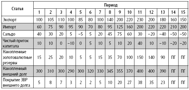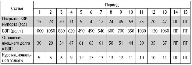 Логика у инвесторов следующая. Излишний приток валютных ресурсов позволяет прогнозировать как минимум стабильность национальной валюты страны-экспортера и рост внутренних цен, номинированных в том числе и в СКВ. Данная комбинация, несмотря на существенную инфляцию, приводит к увеличенной доходности в долларах США, росту курса национальных компаний, деловой активности и др. Данные факторы еще больше способствуют притоку внешних портфельных инвестиций, которые иногда неискушенными политиками и экономистами трактуются как результат благоприятного экономического климата в стране. Одновременно с притоком капитала увеличивается внешний долг государства, который в дальнейшем будет дополнительным негативным фактором для финансовой стабильности в долгосрочном плане. Упрощенно общую динамику ряда экономических и финансовых показателей страны – экспортера сырья можно выразить следующими данными (табл. 21).