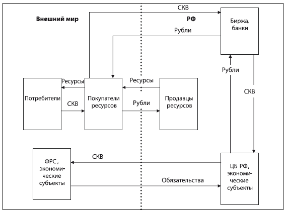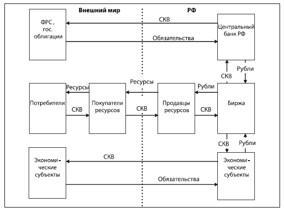 Блок-схема № 1. Движение сырья, идущего на экспорт, и валютной выручки (СКВ). Основной смысл – российские экспортеры получают за товар СКВ. Полученную валюту могут продать, могут не продавать. В настоящее время РФ имеет положительный счет текущих операций (до 100 млрд долл. – 2008 год), соответственно, основным покупателем является ЦБ РФ. Далее купленную СКВ инвестируют в безрисковые обязательства, номинированные в СКВ. Все логично.