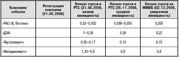 После теоретических аспектов вернемся к реальной ситуации, где все этапы становления рынка акций «РАО ЭС Востока» сведены в табл.