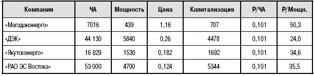 3. Как говорилось выше, материнская компания состоит из дочерних компаний, по которым проделано все то, что по «РАО ЭС Востока» (графики с уровнем цен в диапазоне от сверхдешево до сверхдорого). Для наглядности стоимость акций дочерних компаний приравняли к цифровым значениям материнской компании. Таким образом, получаем альтернативу. Например, при прочих равных условиях компания ДЭК при текущей стоимости в 0,26 руб./акция (чистые активы) равноценна стоимости одной акции «РАО ЭС Востока» 0,124 руб./акция и т. д. Соответственно, инвестор смотрит, через какие акции целесообразнее купить долю в будущей компании.