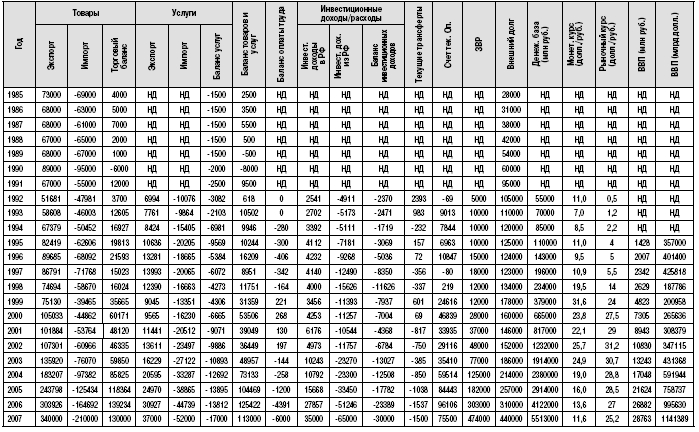 ПОКАЗАТЕЛИ ПЛАТЕЖНОГО БАЛАНСА И МАКРОЭКОНОМИЧЕСКОЙ СТАТИСТИКИ РФ 1985–2007 ГГ. (МЛН ДОЛЛ.)
