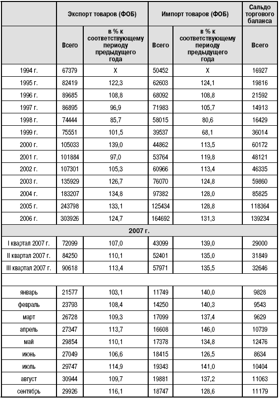 Следует помнить, что в настоящий момент величины экспорта и импорта являются аномально высокими. Объем экспорта превысил 110 млрд долл, лишь в 2003 году. До этого средняя величина экспорта товаров не превышала (с 1985 года) 80 млрд долл. (табл. 6). С учетом многих нюансов нельзя исключать, что в дальнейшем объем экспорта товаров может составлять не более 100–150 млрд долл.