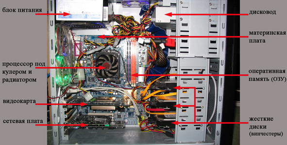 Компьютер можно сравнить с набором игрушечных кубиков. По отдельности какие-то фрагменты, а собранные правильно вместе – цельная картинка. Я уже говорил, что в дебри мы вдаваться не будем, поэтому буду объяснять все кратко и понятно. Итак, минимальный набор для работы состоит из системного блока, монитора, мыши и клавиатуры. С помощью мыши осуществляется управление компьютером, с помощью клавиатуры так же управление и ввод информации, монитор показывает изображение. Думаю, с этим все понятно. Устройство и настройку мыши и клавиатуры мы рассмотрим позднее, а пока устройство системного блока. Вид изнутри: