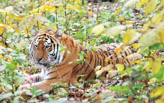 «Такая окраска является для тигра вполне защитной. Когда он бежит по тайге, среди кустарников, лишённых листвы, чёрный, жёлтый и белый цвета сливаются, и зверь принимает однотонную буро-серую окраску. Осенью среди оранжево-красных виноградников и сухих жёлтых папоротников, в которых есть немало почерневших старых листьев, тигра трудно увидеть даже на близком расстоянии», – пишет В. К. Арсеньев.