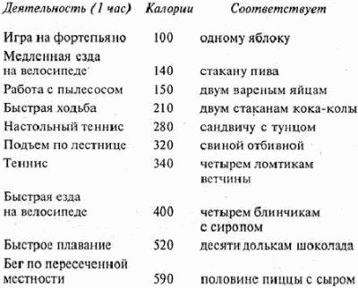 Ничего подобного. Вопреки распространенному мнению, спорт и физическая работа не так уж сильно «сжигают» калории. Марафонская дистанция, которую преодолел посланец царя Федиппа, стоила ему всего лишь около 3 тысяч калорий – это примерно столько же, сколько получают читатели этой книжки после сытного обеда. Ниже приводится таблица примерного расхода калорий для мужчины весом 70 кг (для более плотных расход в калориях будет несколько выше, для людей полегче – ниже, женщины потребляют в среднем меньше калорий).