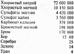 Кстати сказать, помимо золота в морской воде имеется и много других минералов. Вот таблица, в которой приводится количество минералов в тоннах на кубический километр морской воды: