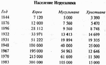 Вот как выглядят истинные цифры населения Иерусалима за прошедшие сто с лишним лет. Они взяты из «Британской энциклопедии» 1844 года, из французского «Inducateut de la Terre-Sainte» 1876 года и «Палестинского календаря» за 1896 год.