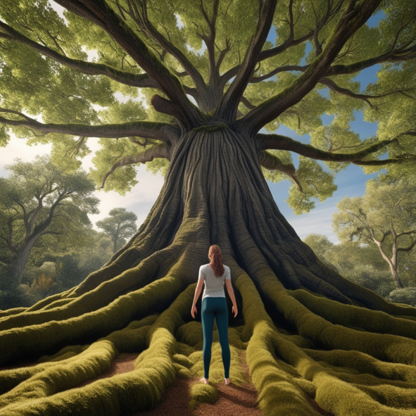 Ощути, как мягкий, тёплый мох под ногами слегка пружинит под твоими босыми ступнями, давая чувство поддержки, безопасности и защищенности, и с каждым шагом ты всё глубже погружаешься в состояние единства с этим древним, могучим, вечным деревом. Остановись, закрой глаза и позволь своему воображению перенести тебя в мир, где это дерево является центром вселенной, соединяя все аспекты бытия.