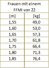 Die für Frauen natural maximal mögliche Magermasse in Relation zur Körpergröße bei einem FFMI von 22, ist aus der Tabelle zu entnehmen. Unter Magermasse versteht man das Körpergewicht abzüglich des Körperfettanteils (KFA). Die Magermasse setzt sich aus den Knochen, der Muskulatur und anderem fettfreien Gewebe zusammen. Die Magermasse ist weiterhin ein wichtiger Faktor bei der Bestimmung des persönlichen Kalorienbedarfs.