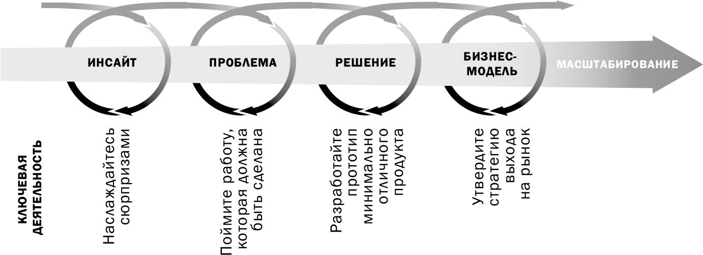 Так, совершая первые шаги (проблема, решение и бизнес-модель), команда Intuit проходит следующий процесс: 1) записать наиболее важное допущение наудачу; 2) придумать эксперимент для его проверки; 3) провести эксперимент, чтобы получить ответ; 4) вернуться обратно, чтобы сформулировать следующее допущение наудачу, на которое команде нужно будет дать ответ.