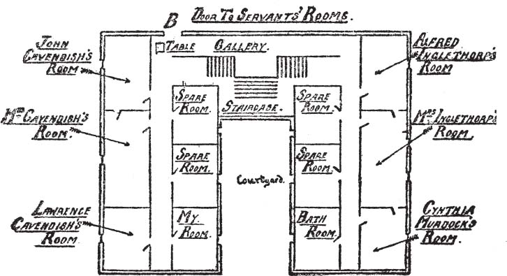 To make this part of my story clear, I append the following plan of the first floor of Styles. The servants’ rooms are reached through the door B. They have no communication with the right wing, where the Inglethorps’ rooms were situated.