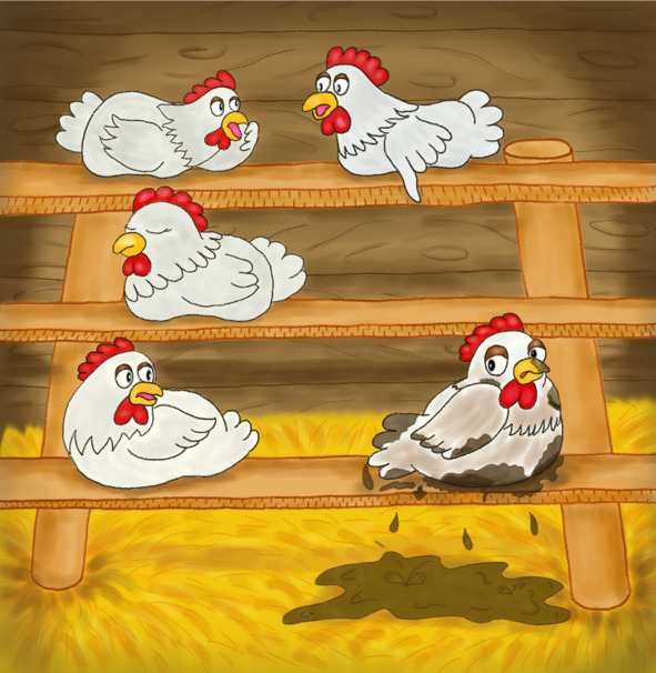На следующий деньСобрался двор,Чтоб в новый часКуриный выслушать рассказ.Та села, сделав важный вид,И говорит:– За гранью нашего двораНет никаких красот!И горных нет высот!Есть только грязьИ сорная трава —Забудьте путь туда:Здесь лучше вам остатьсяНавсегда!