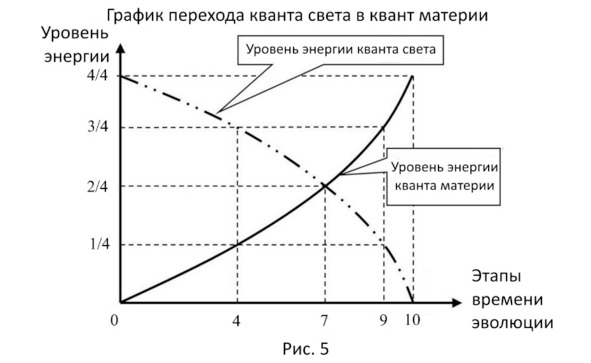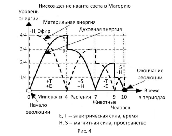 На рисунке 4 в конце 4-ого этапа нам пришлось показать резкое падение энергии кванта света на 1/4 часть. На этом падении электрической силы кванта света заканчиваются первые 4-е этапа цикла Сатья-Юга. Так создавалась плазменно-минеральная цивилизация. Часть электрической силы пошла на формирование типического плазменного мира минералов, который далее остался существовать, вобрав в себя 1/4 часть энергии кванта света.