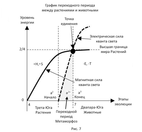 Давайте отдельно разберём пример одного такого переходного периода между цивилизациями, например, растений и животных. Мы покажем его отдельно на рисунке 7. С левой стороны рисунка 7 мы видим растущий типический мир Растений, который формируется магнитной силой положительной полярности +Н. Когда он достигает уровня разума а2+, то начинается переходной период. Он показан на рисунке 7 светло-серым цветом. В это время начинает свою работу отрицательная электрическая сила -Е, которая будет формировать мир Животных. В переходном периоде обе силы действуют одновременно, что и позволяет сформироваться смешанному переходному виду.