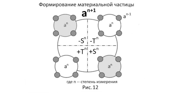 Вещество обладает свойством сопротивляться любому силовому воздействию на себя, что заставляет его дублировать это внешнее воздействие как бы с обратным знаком, чтобы его полностью нейтрализовать. Ему приходится формировать в себе единичную ЭСН полностью тождественную Божественному Свету, но зеркально обращённую ей. В этом случае в Изначальном Веществе возникает новая ЭСН, которая уже будет его единичной частицей с уровнем а0. Эту зеркальную Божественному Свету единичную ЭСН Изначального Вещества уже можно будет назвать первой частицей Материи. Мы уже показали её ЭСН на рисунке 10.