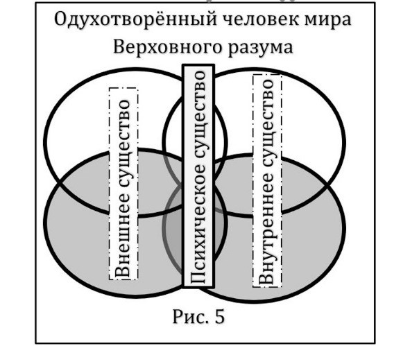 – Если нам, оставаясь в Пространстве, ещё одновременно к внешнему разуму удасться обрести внутренний разум Времени и соединить их вместе, то куда нас приведёт единение Материи и Духа? К одухотворению Материи и новому эволюционному скачку, к одухотворённому виду человека (рисунок 5). Явно третий вариант выглядит для нас более привлекательным, чем первые два, но более сложным.