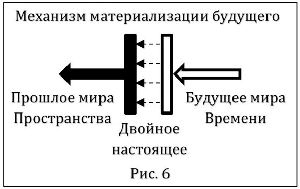 На рисунке 6 видно, что, проходя «расстояние» между двумя «обкладками» настоящего, тонкая материя мира Времени превращается в материю мира Пространства, что и позволяет будущему материализоваться в нашем мире. Этот процесс материализации осуществляется именно здесь, в двойном настоящем. Можно его даже назвать «механизмом материализации».