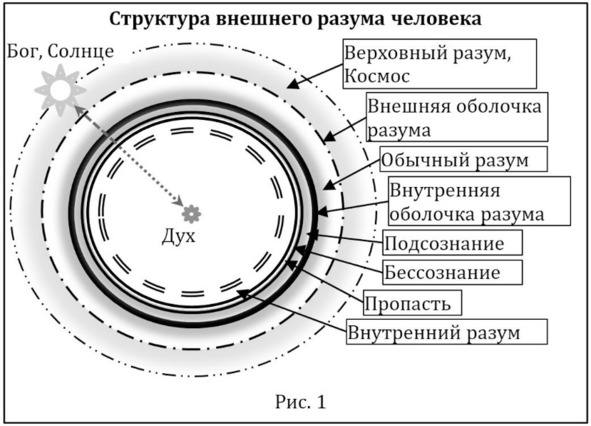 Давайте начнём с внешнего разума, который мы используем в своей жизни и который мы уже хорошо знаем. Он схематически представлен на рисунке 1, но мы добавили к нему ещё и внутренний разум, Бога и Дух. Мы его полную структуру решили отобразить на поверхности планеты Душа человека, о чём мы говорили ранее [1]. Естественно, он представлен на её поверхности отдельным слоем.