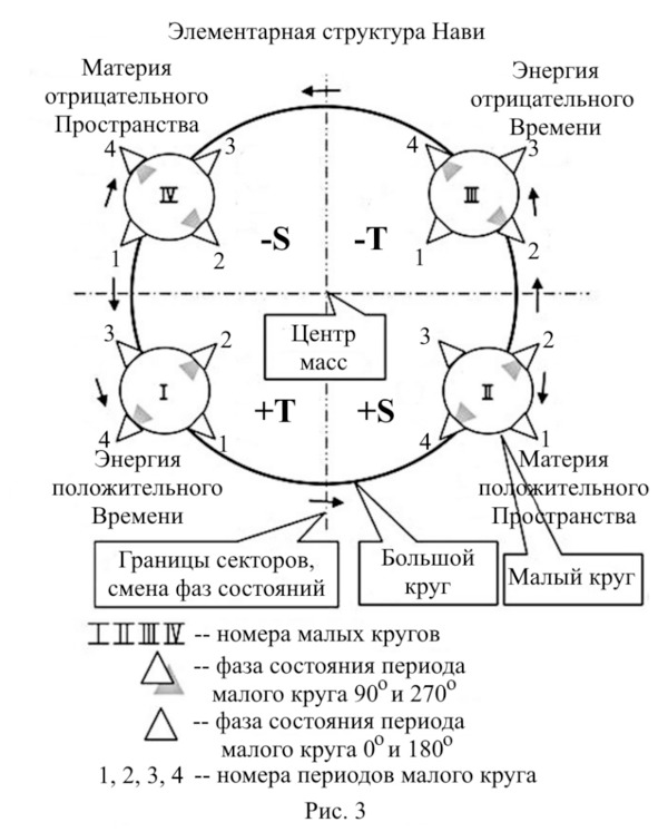 Только для этого нам как-то сначала придётся совместить между собой мир Пространства и мир Времени. К нашей радости, это уже сделано. Уже имеется «Единая теория Мироздания», которая их сумела объединить. В основе единения этих двух миров лежит «элементарная структура Нави» [6]. Она позволяет нам определить точную структуру Солнечной системы, располагающуюся в этих мирах. Но сначала нам придётся описать «элементарную структуру Нави» (далее ЭСН), на основе которой структурно формируется Вселенная, в том числе и Солнечная система [6].