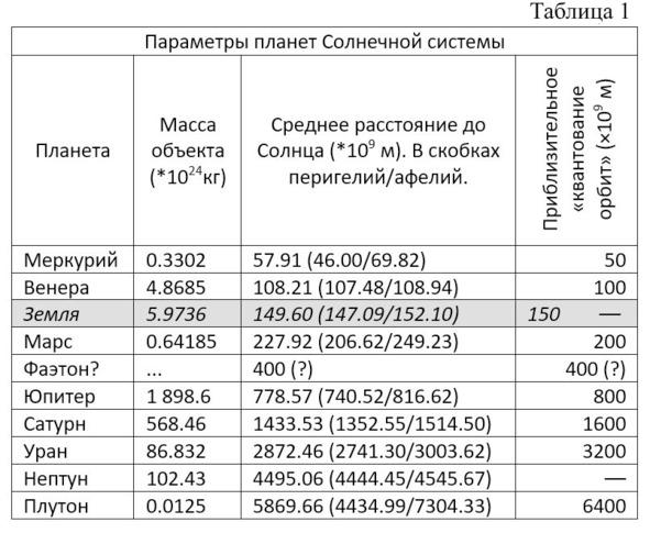 Прежде, чем начать исследование формирования планет Солнечной системы, давайте рассмотрим те научные данные об орбитах планет, которые существуют в гелиоцентрической системе Коперника. Мы их укажем в таблице 1. Нас, конечно, более всего интересует последний столбик этой таблицы. В нём параметры орбит планет мы специально загрубили и сделали сильно приблизительными, чтобы лучше увидеть некую скрытую закономерность в структуре этой системы.