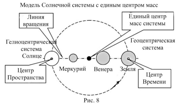 Если предположить наличие такого центра масс в Солнечной системе, тогда становится объяснимой некоторая нестыковка в параметрах двух её первых орбит планет Венеры и Меркурия. Они оказываются как бы внутри окружности вращения этих двух центров Пространства и Времени и центра масс этой системы. Это показано на рисунке 8. Они попадают под влияние не только силовых полей Солнца, но и Земли.