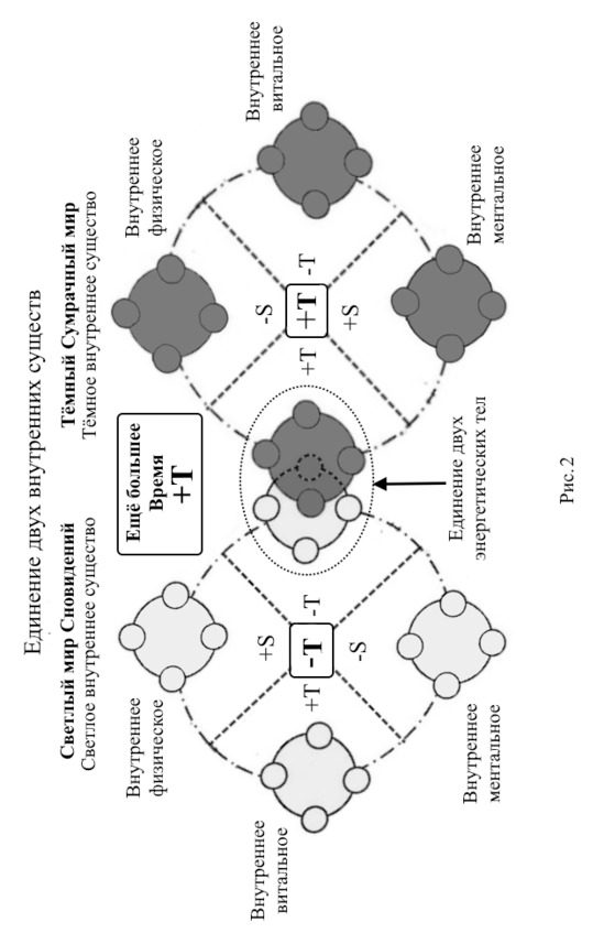 Аналогичная ситуация возникает и с двумя внутренними существами тонкого человека двух сфер Времени с противоположными знаками состояний. Она аналогична единению между собой двух миров Бодрствования, показанное на рисунке 14 [1]. Единение внутренних существ двух сфер Времени мы изобразили на рисунке 2.