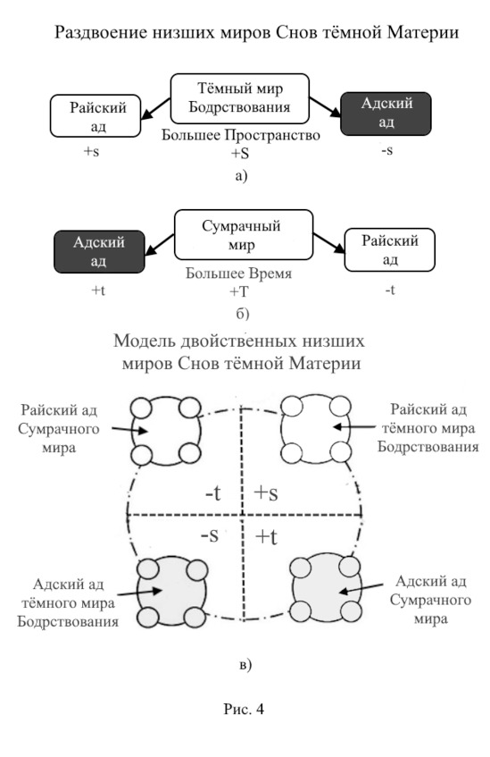 Итак, мы имеем два Ада: естественный и ложный. На рисунке 3б показана «модель пяти колец» двух низших миров светлой и тёмной Материй. Верхний полукруг принадлежит светлой Материи и имеет прямое отношение к Раю; низший полукруг отнесён к тёмной Материи и имеет прямое отношение к Аду. Рай нас не интересует, а вот Ад получается двойным, обладающим пространственно-временными параметрами двух низших миров Снов тёмной Материи.