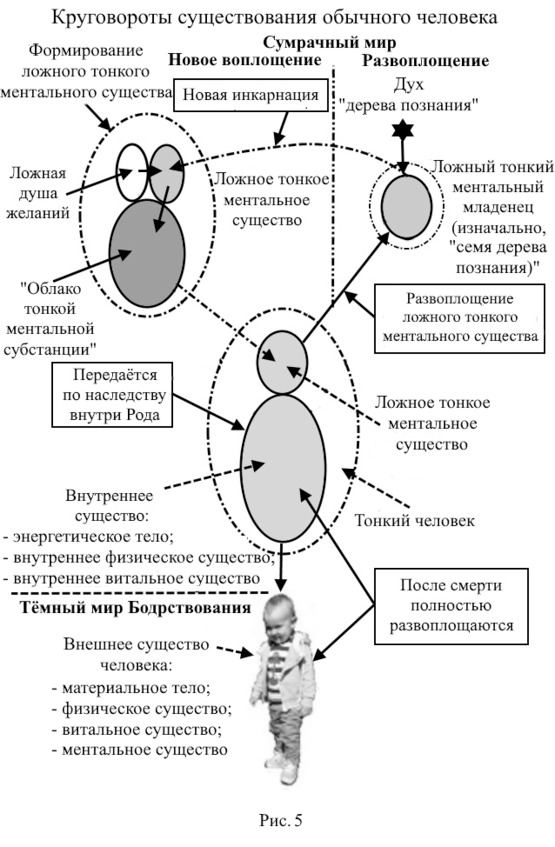 На рисунке 5 видно, что ложное тонкое ментальное существо после смерти человека остаётся в Сумрачном мире, но вместо нового прорастания из «семени» до зрелого внутреннего ментального существа, оно развоплощается из своей тонкой ментальной субстанции, но только до состояния ложного тонкого ментального «младенца». Оно сворачивается до его уровня. Его время в «жизни после смерти» движется в обратную сторону: от зрелого ложного тонкого ментального существа к состоянию ложного тонкого ментального «младенца».