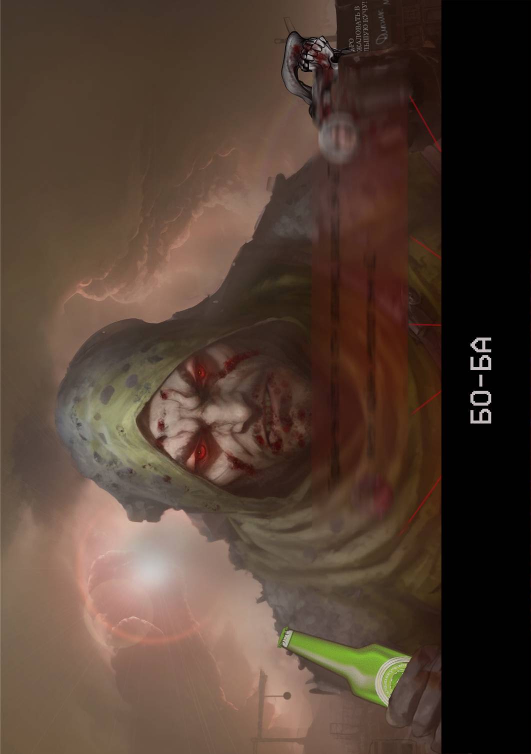 Бо-ба – полная противоположность по габаритам. Его рост достигает два с половиной метра, хоть он сильно сгорблен и никогда не выгибается полностью. У него маленькая лысая башка, с сильно выпирающей нижней челюстью, из которой частенько вытекает слюна на тёмную бородку. Крайне выпуклые глаза, для наблюдателя кажущиеся туповатыми, хотя таковым он не является. Бо-ба отличается крайне массивным телом, а особенно руками, в обхвате достигающими больше одного метра! Сто пятидесяти килограммовый трутень для него лёгкая разминка, ведь Дипчик сам наблюдал, как он в одиночку поднимал над собой тридцати тонного сповота. Бо-ба постоянно донимал Дипчика рассказами о компьютере, который тот себе хочет сделать. Он частенько желает погрузиться в виртуальную реальность точно так же, как и богатеи с телевизора и играть в самые новые игры 22-го столетия. Когда-то, в далёком прошлом у Бо-бы был компьютер, но он разбил его в попытках ткнуть пальцем в кнопку включения…