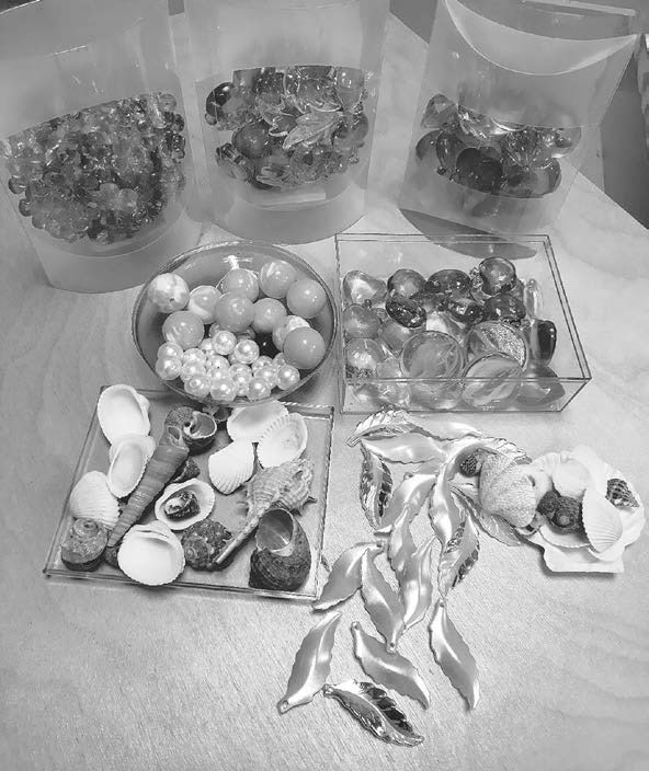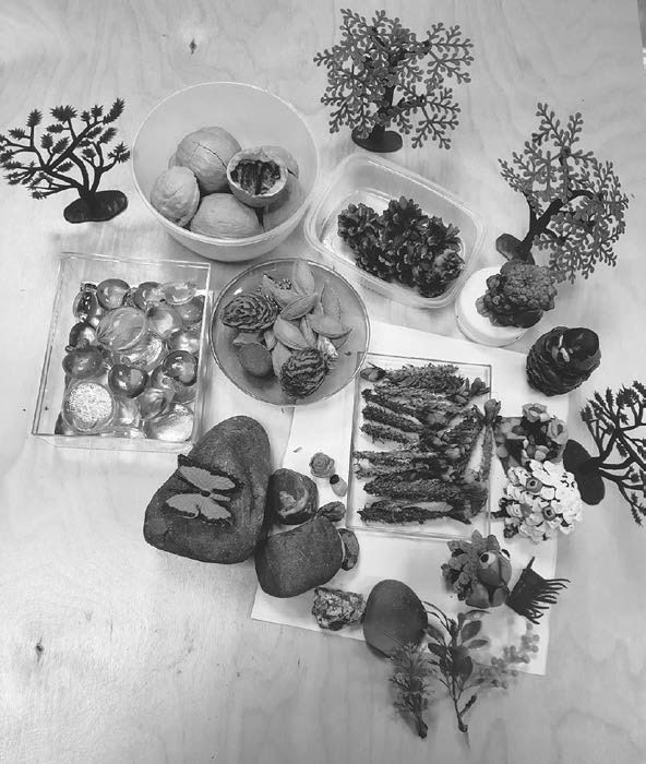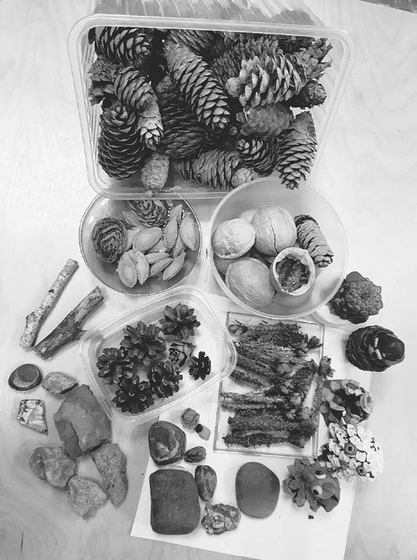 – природные материалы (камни, кристаллы, ракушки, кораллы, мох, кора и плоды деревьев, перья, сухие ветки, засушенные цветы);